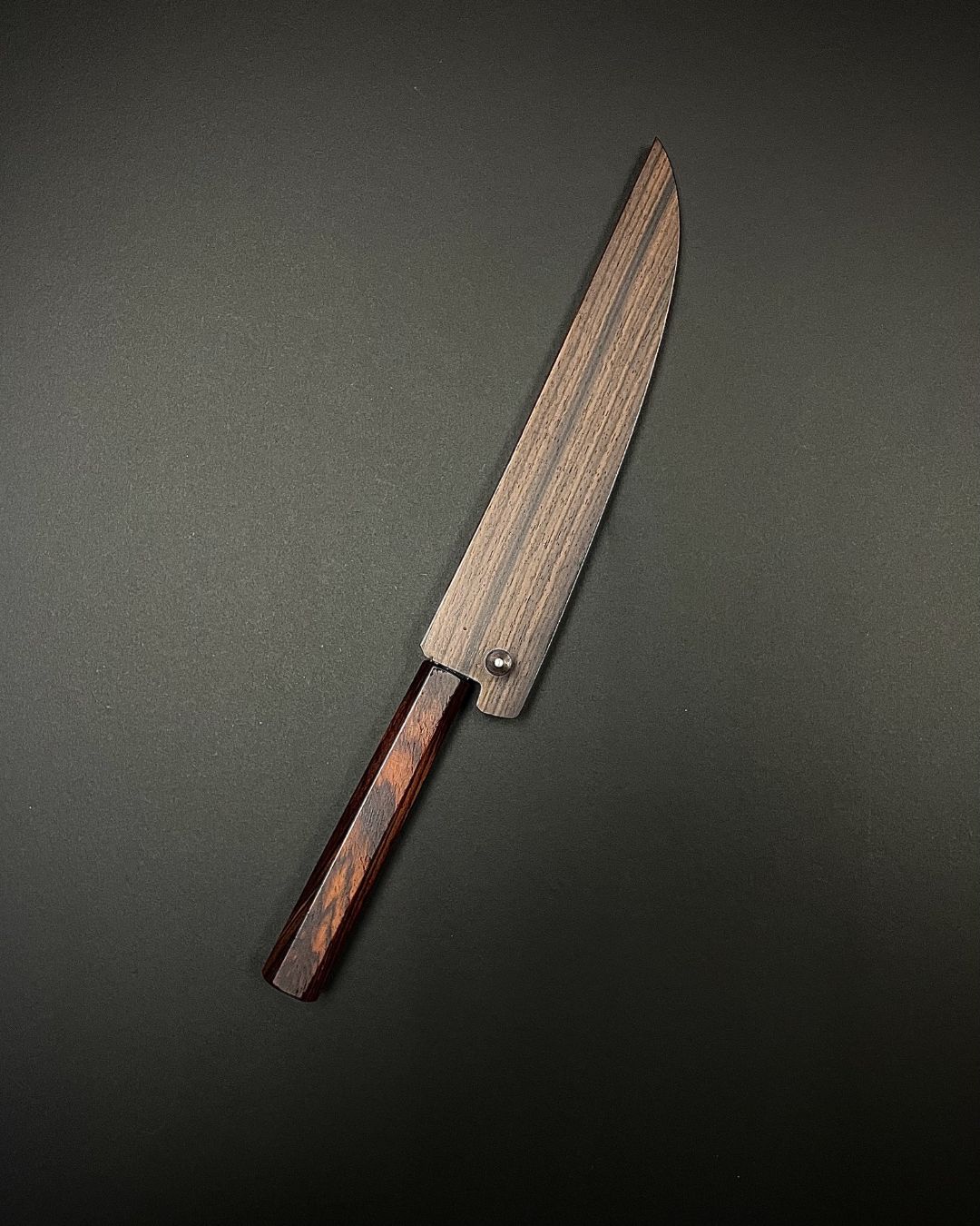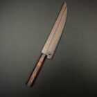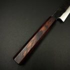 The knife is fitted with a smooth rosewood handle, providing a warm, natural grip that feels balanced and comfortable in hand. Paired with a matching rosewood saya, it ensures both protection and a cohesive, elegant presentation.
