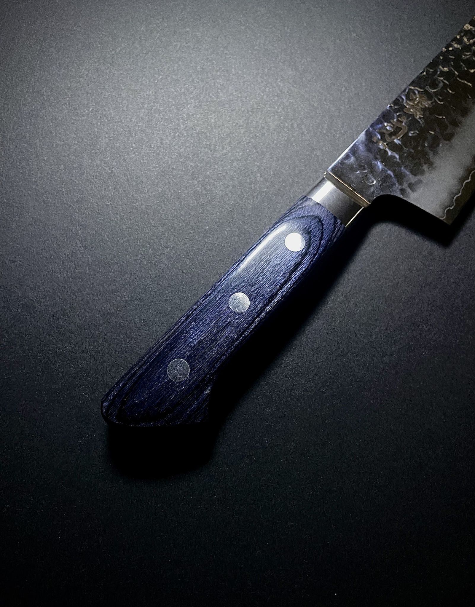 The blade features a Tsuchime (hammered) finish, which not only gives the knife its unique character but also helps reduce food from sticking to the blade during slicing. The Kiritsuke-style tip allows for precise work such as fine slicing, trimming, and detailed vegetable cuts, while the flatter profile makes it excellent for push cutting and chopping.