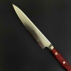 The Takamura Migaki petty is constructed of R2 powdered metallurgy steel, an advanced steel capable of taking acute and highly refined edges ideal for making clean cuts.